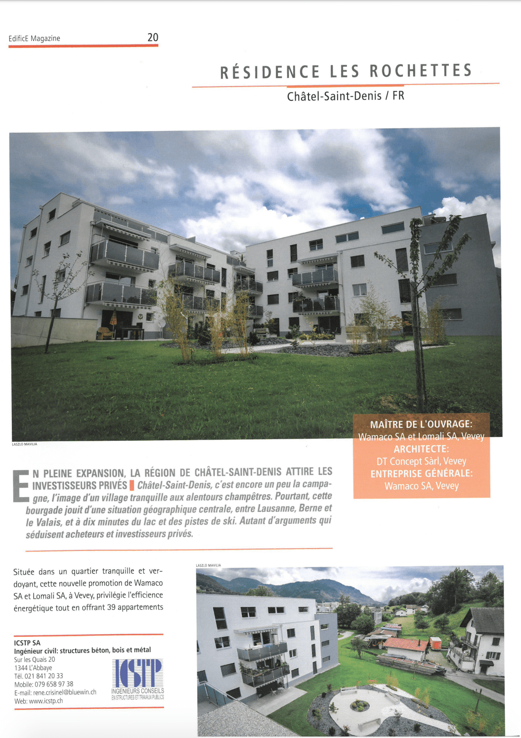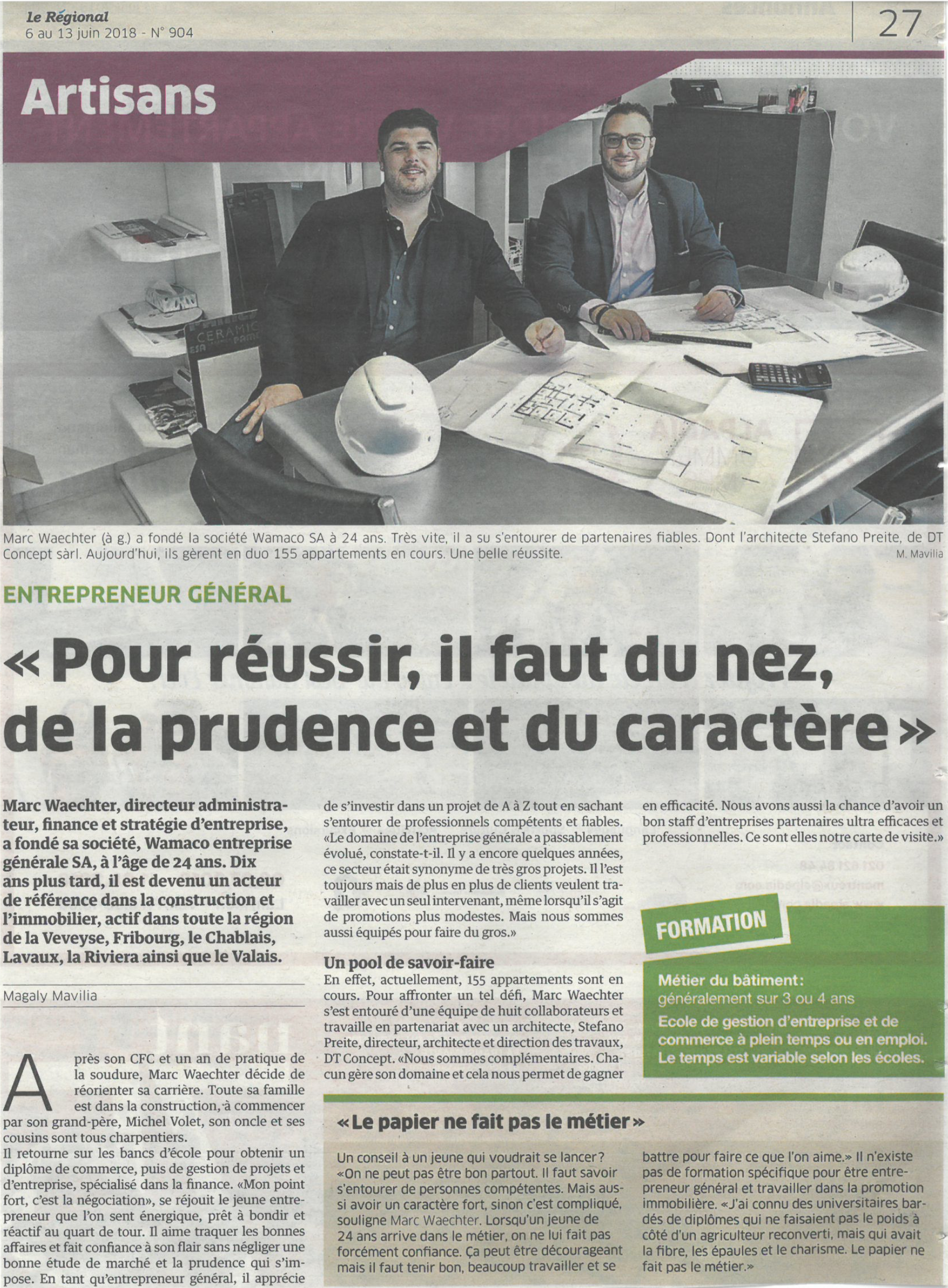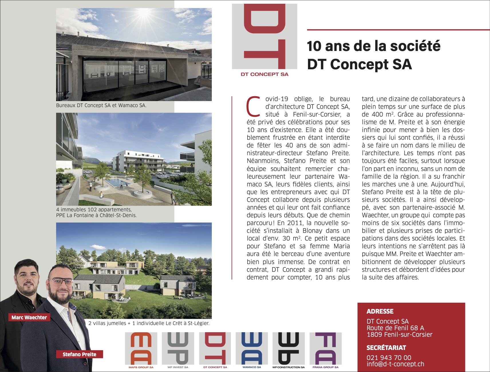 Riviera-Chablais 15 juin 2022 Gérer un chantier soi-même ou faire appel à des professionnels de la construction ? Journal de Corsier-sur-Vevey 16 juin 2022 DT-Concept SA et Wamaco SA Riviera-Chablais 24 mars 2021 10 ans de la société DT Concept SA Le régional 6 au 13 juin 2018 Pour réussir, il faut du nez, de la prudence et du caractère Edifice Magazine N° 3 / 2018 - Juin Résidence Les Rochettes