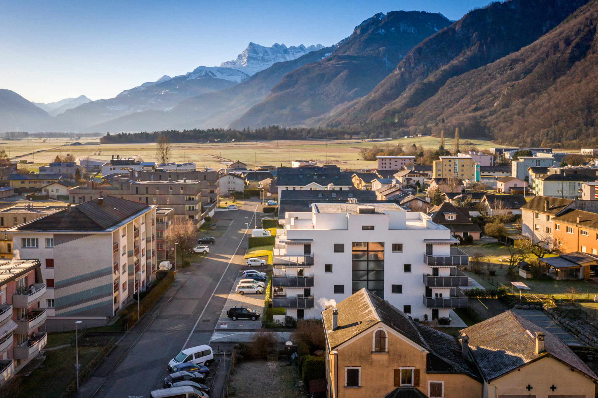 Démolition d'une villa avec garage et construction d'un immeuble de 25 appartements label Minergie avec un parking souterrain de 21 places et 11 places extérieures.